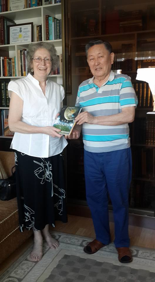 Встреча с Адилем Курманжановичем Ахметовым, писателем, дипломатом, экс-сенатором, знатоком казахского и английского, который любезно посмотрел первый драфт перевода и дал свои ценные замечания. Белинда просила не снимать ее босые ноги. Но вы же посмотрите не на ноги, а на книгу "Код Евразии", правда?