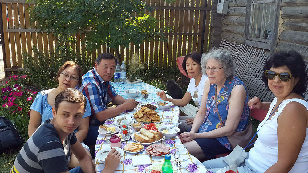 За столом, Боровое. Слева направо: Омар, сын Эрики, Серикбай Ташенов, Зира Наурзбаева, Белинда Бриндл, Эрика