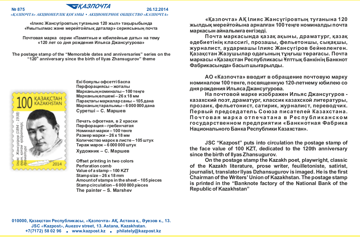 Казпочта выпустила марку достоинством в 100 тенге к 120-летию Ильяса Джансугурова.