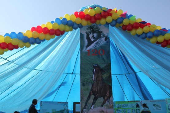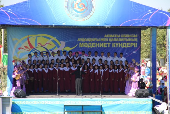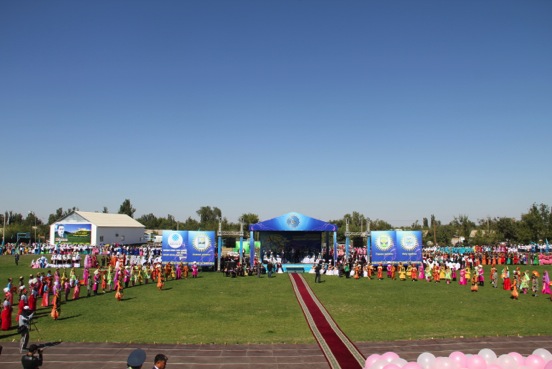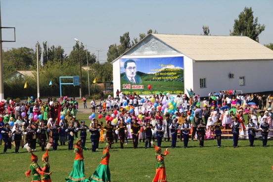 Самое большое и красочное торжество прошло на спортивном стадионе, который стал в этот день огромной концертной площадкой с прекрасной панорамой. Здесь перед трибунами установили сцену, на заднем плане на стене здания висел большой портрет Джансугурова. Погода в этот день полностью соответствовала праздничному настроению: солнце, бескрайнее синее небо, по осеннему свежий воздух добавили ярких красок!